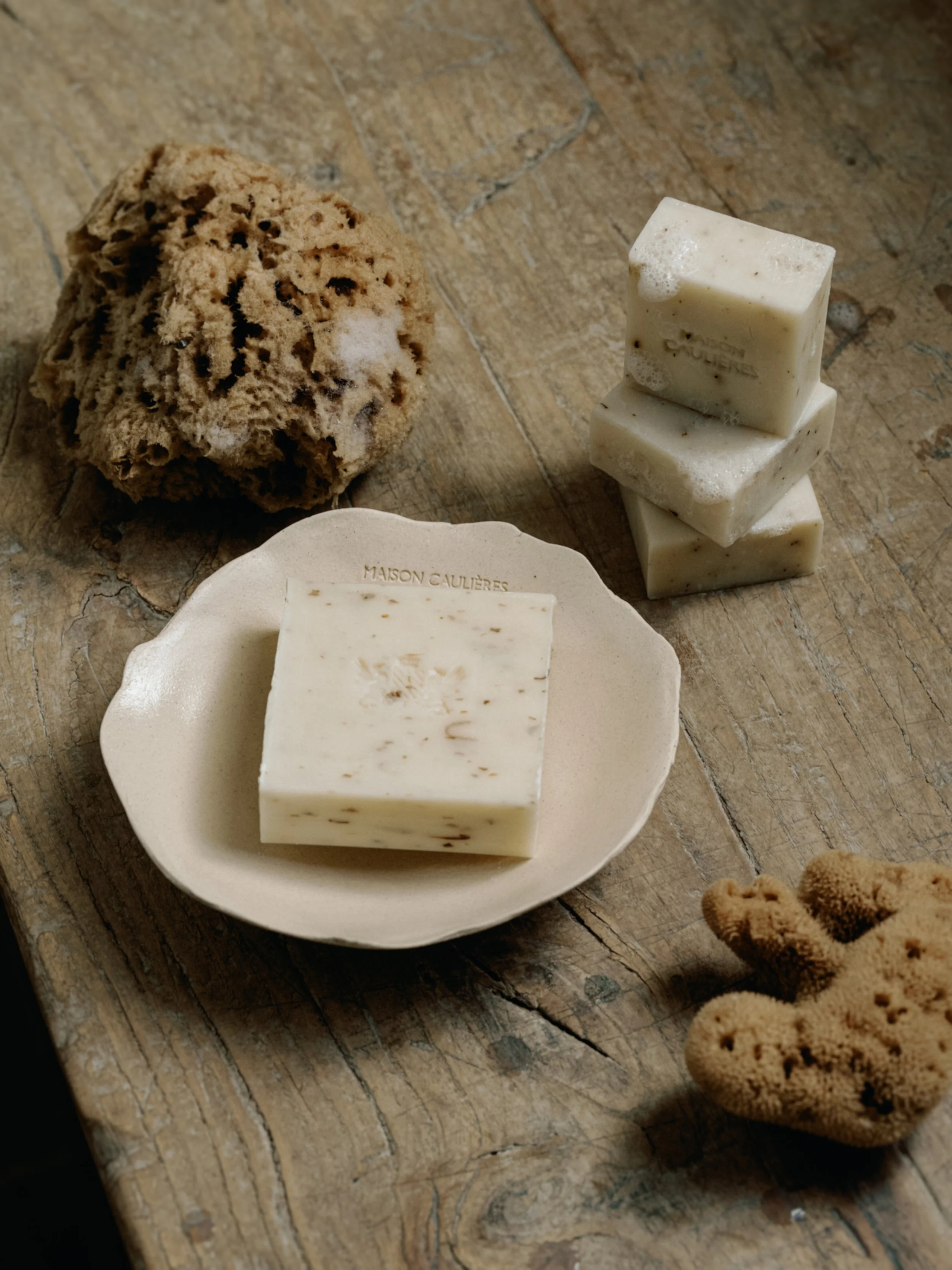 faites mousser le savon entre vos mains humides, frottez doucement, puis rincez abondamment. Laissez sécher dans le porte-savon Maison Caulières.