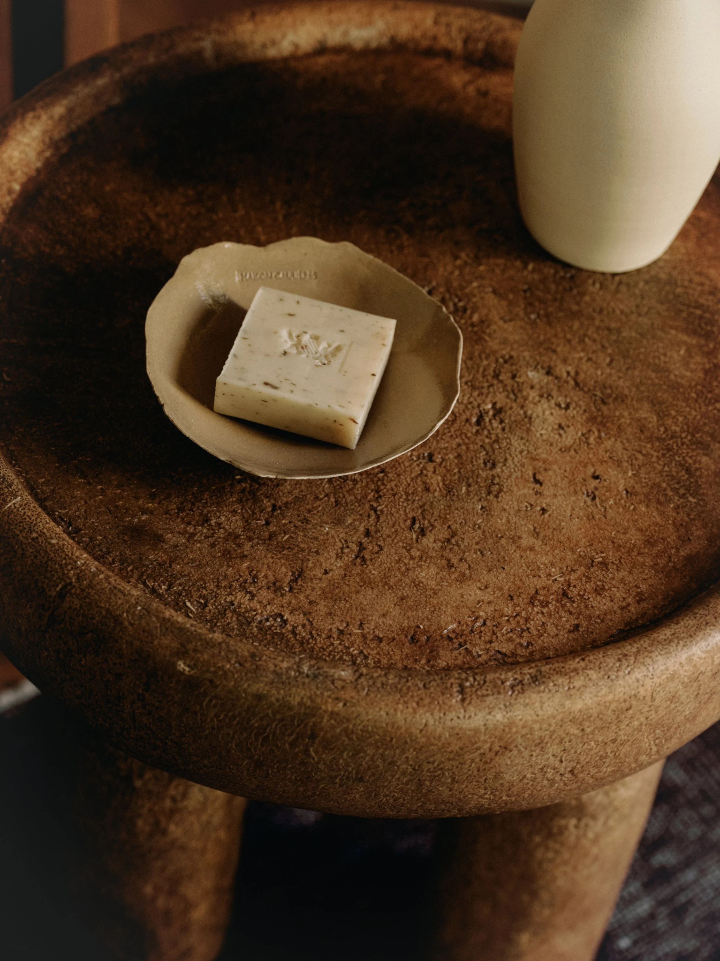 faites mousser le savon entre vos mains humides, frottez doucement, puis rincez abondamment. Laissez sécher dans le porte-savon Maison Caulières.
